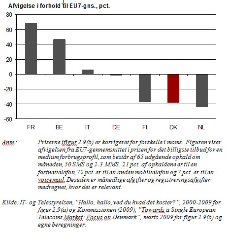 Danmark hører dermed til blandt de billigste lande i EU inden for mobiltelefoni. I 2008 lå de danske priser 38 procent lavere end prisgennemsnittet i de sammenlignelige EU-lande, når der ses bort fra moms og afgifter. Holland og Finland har priser på samme niveau, mens det er en del dyrere i de øvrige lande.