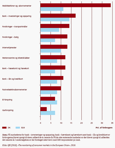 På markedet for mobiltelefoni har mere end én ud af tre danske forbrugere skiftet leverandør inden for en periode på 12 måneder. Gennemsnittet blandt de sammenlignelige EU-lande er ca. 1 ud af 10. En medvirkende forklaring kan være, at bindingsperioderne er kortere i Danmark end i mange sammenlignelige lande. Danske forbrugere skifter sjældnere el- og gasleverandør.
