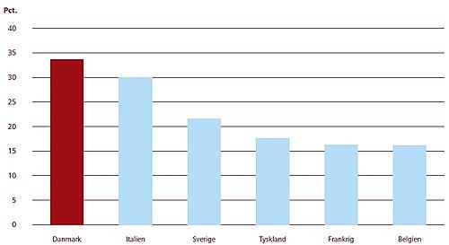 Note: Oplysningerne fra Nielsen om andelen for Italien er udelukkende baseret på data fra hypermarkeder og supermarkeder og ikke discount og minimarkeder. Hvis flere varer sælges på kampagne i hypermarkeder og supermarkeder end i discount og minimarkeder, er andelen af varer solgt på kampagne overvurderet for Italien. For at tage højde for dette er tallet for Italien korrigeret ned med 3,4 procentpoint i ft. det opgjorte tal fra Nielsen ud fra en antagelse om, at Italiens butiksstruktur er den samme som i Danmark. I Danmark sælges ca. 37 pct. af varerne på kampagne i supermarkeder/hypermarkeder. Det er 3,4 procentpoint mere end for alle butikker under ét. Oplysninger fra Nielsen om andelen for Tyskland er korrigeret op med 2,1 procentpoint i forhold til det tal, styrelsen oprindeligt modtog fra Nielsen. Det skyldes, at andelen var beregnet på baggrund af stk. i stedet for i kg./l., som for de andre europæiske lande. Korrektionen på 2,1 procentpoint er foretaget ud fra data for Frankrig, hvor andelen i stk er 14,1 pct. og andelen i kg./l. er 16,2 pct. I Danmark er forskellen på 0,8 procentpoint, og i Italien er forskellen på 1,8 procentpoint. Det peger i retning af, at andele beregnet på baggrund af stk. er lidt mindre end andele beregnet på baggrund af kg./l. Der korrigeres med udgangspunkt i tallene fra Frankrig, fordi Frankrig er stort centraleuropæisk land som Tyskland, og fordi tallene for Italien alene er baseret på hypermarkeder og supermarkeder.
